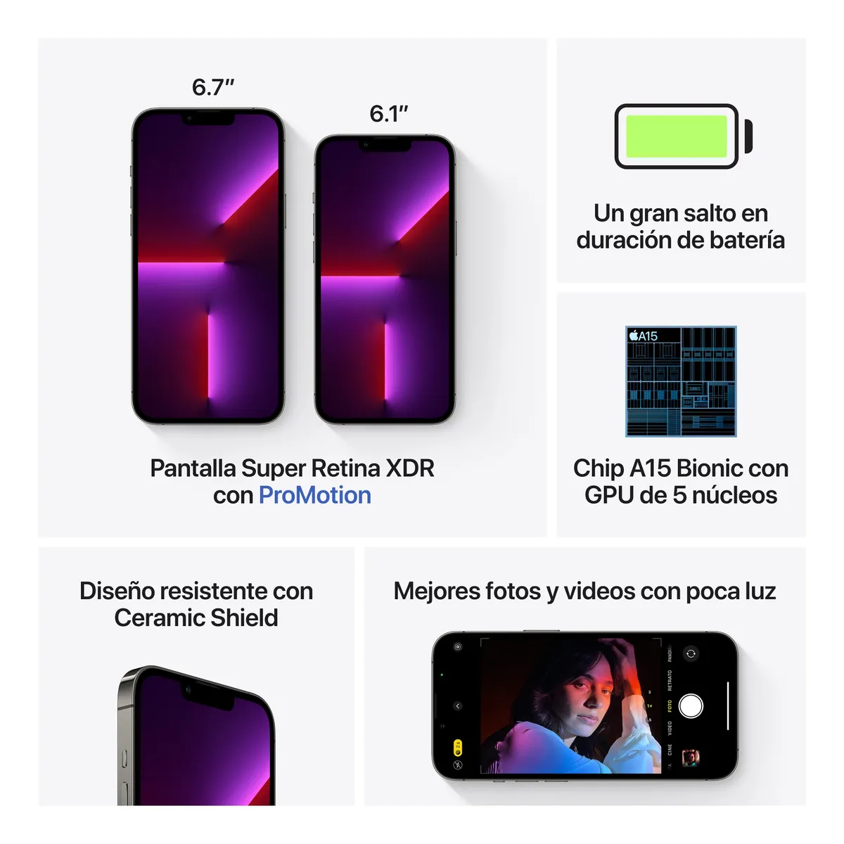 CHIP A15 BIONIC — Equipado con el potente chip A15 Bionic con CPU de 6 núcleos y GPU de 5 núcleos, el iPhone 13 Pro Max garantiza un rendimiento sobresaliente en todo momento. Perfecto para multitarea, gaming exigente, edición de video y apps profesionales.